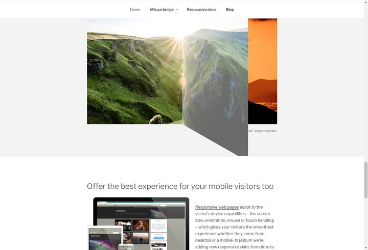 Having an image gallery on your site ensures your visuals remain captivating. Whether you're a blogger looking to improve user engagement or a presenter showcasing work, jAlbum offers full control over your photo gallery setup. The mobile-friendly design ensures your image galleries look stunning on any device, keeping your audience engaged no matter how they access your content.
