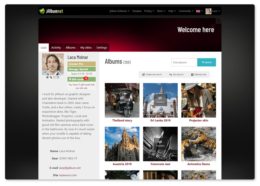 Create beautiful web galleries and upload them to yourname.jalbum.net. You can also use your own domain. The Premium account comes with a generous 10 GB of web space! The Standard license also included, valid with your active Premium account.
